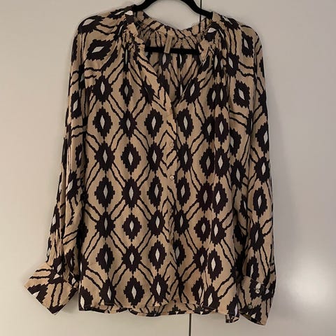 Gestuz skjorte til kvinder i str. 42. Skjorten er multifarvet med et mønstret print i overvejende mørke og gyldne nuancer. Materialet er polyester, som giver en let og glat kvalitet. Modellen har lange ærmer med manchetter og gennemgående knaplukning foran. Velegnet til både hverdag og mere formelle anledninger afhængigt af styling.