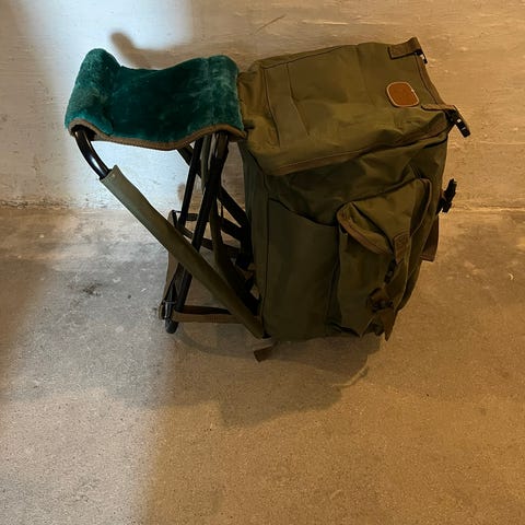 Unknown rygsækstol i grøn tekstil med aluminiumsstel. Rygsækken er integreret med en sammenklappelig stol, så den kan bæres på ryggen og bruges som siddeplads. Tasken har klaplukning med remme og spænder samt skulderstropper på bagsiden. Velegnet til fx fisketure, jagt, picnic eller andre udendørs aktiviteter, hvor der er behov både for opbevaring og en enkel stol.