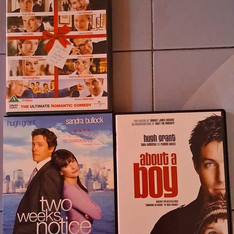 Two Weeks Notice / About a Boy/Love actually dvd film. Indeholder tre spillefilm i dvd-format: "Two Weeks Notice" ,love actually og "About a Boy". Alle tre er romantiske komedier/spillefilm med engelsksproget lyd og dansk titel/tekst på omslaget. Velegnet til afspilning på standard dvd-afspillere, der understøtter det angivne regionsformat på skiverne.