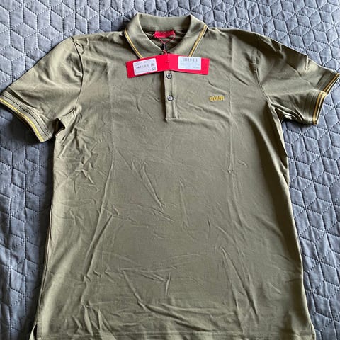 Hugo Boss polo t-shirt til herre i størrelse L. T-shirten er hvid og fremstillet i bomuld. Modellen har kort ærme, knaplukning ved halsen og kontrastfarvet krave med stribet mønster. Diskret Hugo Boss-logo er broderet på brystet.