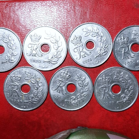 KOMPLET! MARGRETHE II + 25 ØRE 1967, 1969, 1972 FREDERIK IX I alt 19 Mønter!! Prisen er for dem alle!! 25 Øre - Margrethe II 1973 - 1988 Copper-nickel • 4.3 g • ø 23 mm KM#861. Porto 25kr. Op til 100gram!
