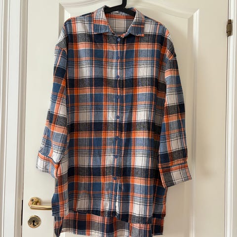 Skjorte i chiffon i flotte brændte farver og med guldknapper.