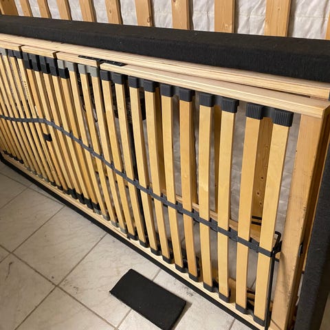Futon elevationsseng som dobbeltseng med to separate madrasser i hvidt betræk. Sengen består af to enkeltstående elevationsbunde, der kan justeres individuelt i hoved- og fodende. Madrasserne har knaplukninger på overfladen og ligger på en metalramme med ben. Egnet som dobbeltseng eller to enkeltsenge, afhængigt af behov og opsætning.