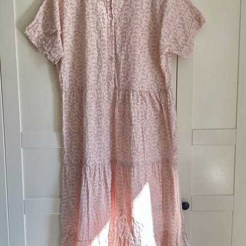 Materialet er 100 % viskose med broderie anglaise-lignende hulmønster. Velegnet som let sommerkjole til hverdag eller ferie.