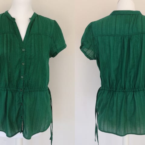 Smuk bluse til kvinder i størrelse M. Modellen er i blå bomuld med korte ærmer. Blusen har rynket halsudskæring med bindebånd foran og let løs pasform. Egnet til hverdagsbrug og kan kombineres med både bukser og nederdel.