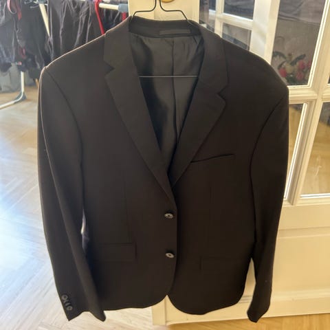 H&M blazer til herre i sort. Jakken er i størrelse 48 (EUR), svarende til ca. 38R. Klassisk model med revers, to-knaps lukning og lommer foran. Foret indvendigt for bedre pasform og komfort. Velegnet som del af jakkesæt eller som separat blazer til hverdag og mere formelle anledninger.