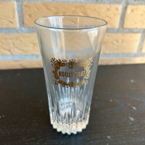 Gulf glas med guldkant i klart glas. Glasset har Gulf-logo på siden og en markeret guldfarvet kant øverst. D amlerobjekt med benzinselskabs-logo.
