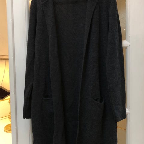 Særdeles velholdt lang strikcardigan i den velkendte strukturstrik fra Siblin Linnebjerg. Modellen er langærmet og åben fortil, d.v.s. uden knapper er anden lukning, hvilket giver et skødesløst og stilfuldt udtryk. Cardiganen egner sig både til hverdagsbrug og pænere brug. Den kan nemt "dresses op" med f.eks. nederdel eller elegante bukser.