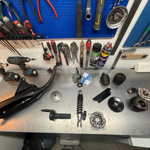 Diverse scooterdele bestående af variatorremskive, Polini krumtap med diameter ø12, gasgreb med tilhørende smådele, original luftfilterkasse til Jog R samt dobbeltstøttefod til Jog R. Delene kan anvendes som reservedele eller udskiftning på kompatible scootermodeller, hvor der ønskes originale eller matchende komponenter til transmission, styring, luftindtag og støttefod.