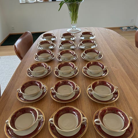 Fem par bouillonkopper/suppeskåle fra det legendariske Hotel Kystens Perle som blev designet af arkitekten Max Louw i 1952. Facade og interiør var bl.a. i rødbrune farver, hvilket også omfattede spisestel m.v. Disse er med stribe i rød og guld samt logo på koppen. Standen er i en robust kvalitet uden skader men med forventelig og varierende slid på guldkanter. En enkelt kop har lidt brunlig misfarvning udvendig.