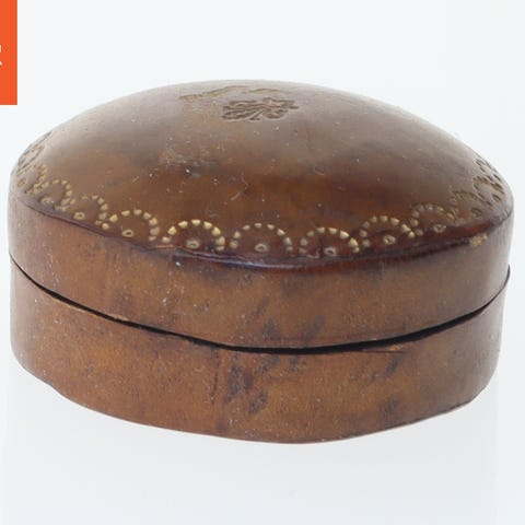 Denne genstand er en dekorativ metaldåse med en størrelse på 16,5 x 14,5 x 9 cm. Dåsen har en rektangulær form med afrundede kanter og et banket mønster i metallet, der giver den et rustikt udseende. Den dominerende farve er guldfarvet med brune patina pletter, hvilket gør den velegnet til dekorative formål. På bunden af dåsen står der 'EDUSCHO KAFFEE', hvilket indikerer, at den oprindeligt kan have været brugt til kaffeopbevaring.