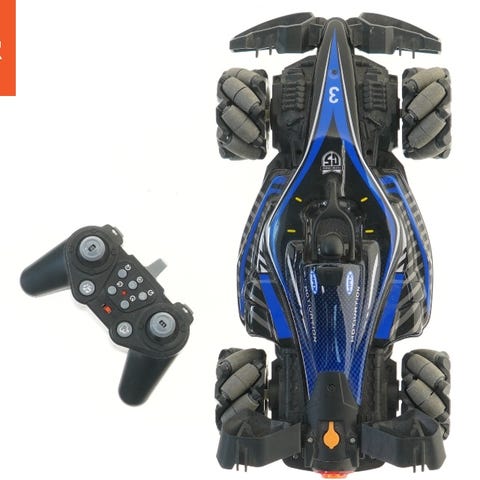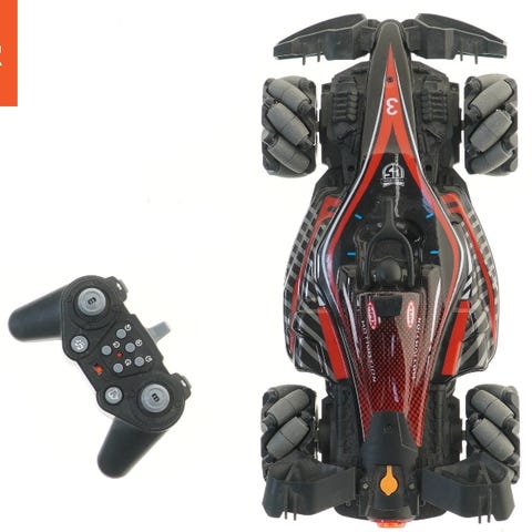 Sharper Image Toy RC Slideways Racer er designet til dynamisk leg og lader dig skifte mellem oprejst kravlekørsel og hover-drift til imponerende manøvrer, mens hjulene roterer 90 grader for at skubbe ud over konventionelle RC-bevægelser.