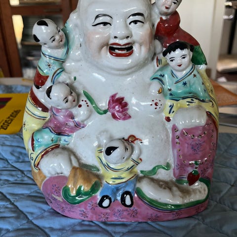 Dette er et bestiksæt der består af knive, gafler og skeer. Bestikket har messing/guldfarvede håndtag som alle er med et dekorativt mønster i form af en Buddha figur i bunden. Alle dele er stemplet Siam, hvilket indikerer fremstilling i Thailand før 1939. Der er 6 gaffel- og knivsæt samt to skeer, en serveringsske og en ostekniv. Alle dele har det samme dekoration i bunden, også knivene, de vender bare den anden vej på foto. Dette sæt er ideelt til en elegant middag eller til brug ved specielle lejligheder og har en klassisk og dekorativ stil.