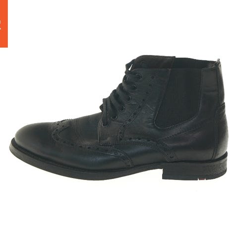 Sort støvle i størrelse 41 med krokodillemønster tekstur. Støvlen har elastiske sidepaneler og lynlåse bagtil for nem af- og påtagning. Passer godt til formelle og uformelle lejligheder.