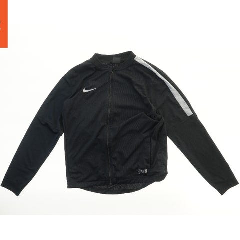 Sort joggingbukser med grå striber langs benene. Bukserne har et elastisk taljebånd med en snor til justering. Der er lommer på siderne. Nike Air-logoet er placeret på forsiden.