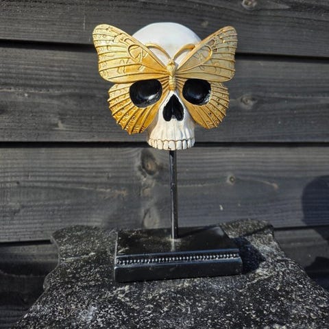 Charmerende sæt af to dekorative skeletbuste, hver unik i stil med elegante tilbehør og raffinerede detaljer. Ét stykke har en sofistikeret hat og smykker, mens det andet holder et hjerte og bærer en klassisk tophat, hvilket skaber en legende men samtidig stilfuld kontrast. Sammen udgør de et særligt og iøjnefaldende duo, perfekt for samlere eller som et statement-dekorationsstykke i ethvert interiør.
