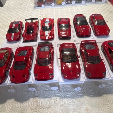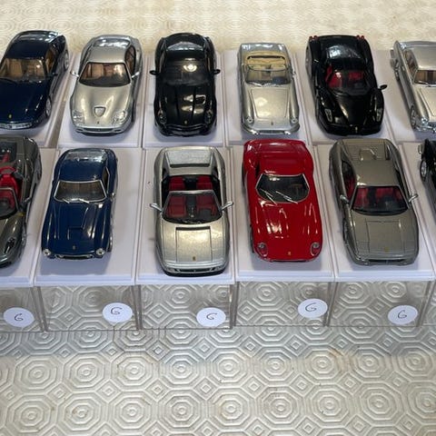 Ferrari racerbilsmodelserie (forskellige kopier som 250 Testa Rossa, 250 GTO, 375 MM, 166/212), 12 stykker i resin og plast, fra 1950'erne-1960'erne, i meget god stand med plexiglas udstillingsboks og erstatningsboks. Klik på den blå "gå til varen" knap, for at købe eller byde på denne vare. Den samlede pris vil blive vist inden du afgiver dit bud.
