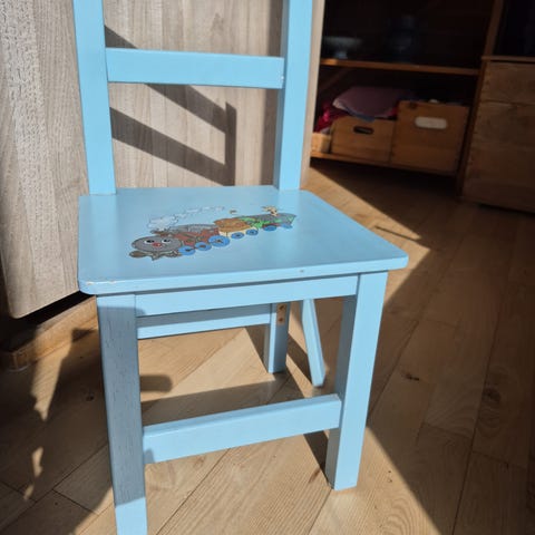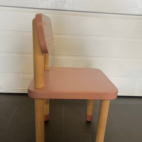 børnestol i grå. Stolen har ryglæn og fire ben med afrundede kanter. Velegnet til brug ved børnebord eller som siddeplads på børneværelset. Overfladen fremstår med enkelte mærker og slid på kanter, som vist på billederne.