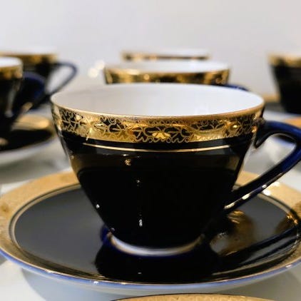 et vintage Lomonosov Imperial Porcelain Factory kaffeservies, designet af A.A. Leporskaja i 1970'erne.