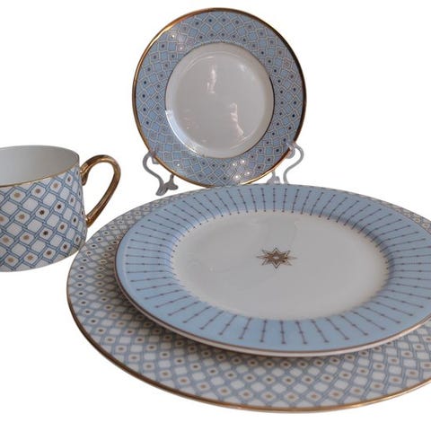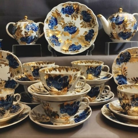Stil: Servicen er udført i boheme-stilen med et koboltblåt drue-mønster og forgyldte detaljer.