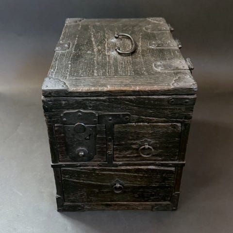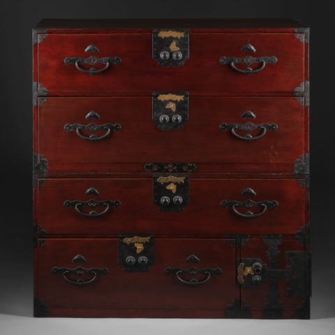 Meget sjælden, original japansk sikkerhedsskab fra det 19. århundrede i keyaki-træ med jernbeslag, 82 cm høj, 51 cm bred og 43 cm dyb, med hængslet dør og fem skuffer med kiri-frontplader og mørkerød lak, alle nøgler inkluderet og i restaureret fremragende stand med ægthedscertifikat. Klik på den blå "gå til varen" knap, for at købe eller byde på denne vare. Den samlede pris vil blive vist inden du afgiver dit bud.