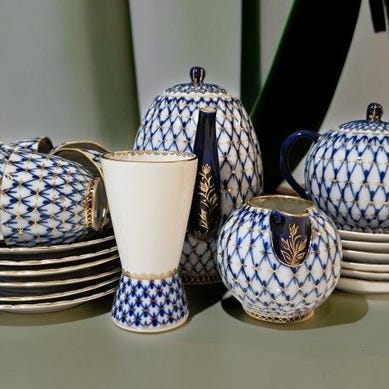 Designet er udført i den elegante "Tulip" form, skabt af den legendariske designer Serafima Yakovleva. Hver del udstråler en sofistikeret kontrast mellem dyb, velouragtig koboltblå og skinnende hvid porcelæne, prydet med indviklede håndmalede bladguld-motiver, der fremkalder en rolig vinternat.