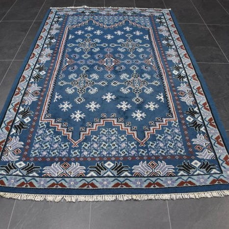 smukt håndknyttet tæppe af uld. Bomuld er på en naturlig måde farvet uden kemikalier. Hovedfarverne er rød, creme, blå og grøn. Tæppet er med en smuk professionel stram knude og har korte frynser.