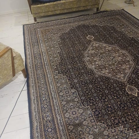 De byder her på et meget smukt orienttæppe -Meshed- i en god samlet stand. Dette smukke tæppe udstråler en hyggelig varm atmosfære. Det er et flot blikfang, betragt dette tæppe med ro og opmærksomhed.