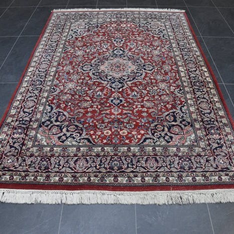 Orientalsk tæppe Meshed, cirka 243 x 169 cm, uld på bomuld, oprindelsesland Indien, i god generel stand med alders- og brugsspor, fremstillet i slutningen af det 20. århundrede. Klik på den blå "gå til varen" knap, for at købe eller byde på denne vare. Den samlede pris vil blive vist inden du afgiver dit bud.