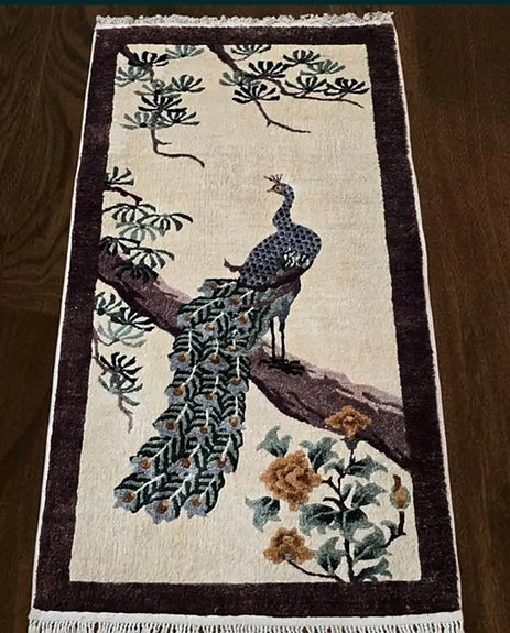 De jævnt placerede kvadrater med traditionelle motiver forener klassisk håndværk med et klart, moderne design. Med den begrænsede farvepalet virker tæppet moderne og samtidig varmt.
