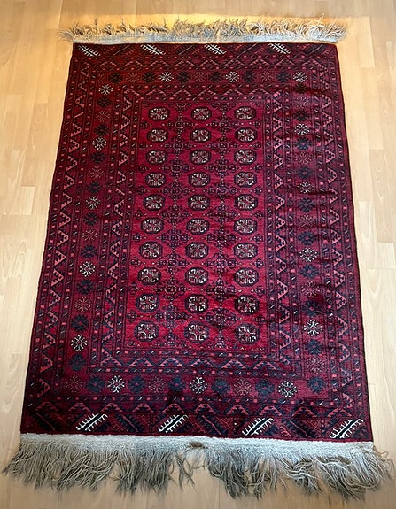 Moderne, håndknyttet designer-tæppe med et enestående feltermønster. Den rolige, melerede naturbund danner en elegant kontrast til de geometrisk anbragte røde ornamentfelter, som giver tæppet struktur og karakter.