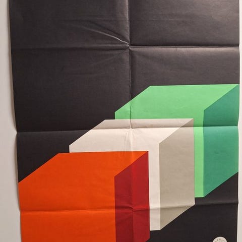 Plakaten skiller sig ud ved typisk tidsalderens grafik, med en baggrund af koncentriske cirkler i klare farver (blå, grøn, gul), karakteristisk for 70'ernes optiske design.