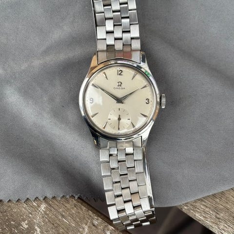 Vintage Omega i rustfrit stål fra 1946. Værket er Omega in-house manuelt værk, cal. 30T2PC, et af de tidligere versioner af det berømte 30mm Omega værker med lille sekundviser. Både kasse og bag-kasse er i rustfrit stål. Serie nr. 10.739.XXX daterer uret til 1946. Der er monteret ny stål krone og nyt glas. Ref. nr. 2383 og diameter er 35 mm. Unik patineret olivengrå farvet skive med Arabertal og klassiske visere passer fantastisk til dette Omega. Uret er serviceret i januar 2026 og det går og holder tiden fint. Der er monteret en ny mørkebrun læderrem med spænde i stål. Der er mulighed for anden farve rem. Der ydes 14 dages returret. Husk, at se andre spændende ure, som jeg har til salg herinde:-) !!!KUN SERIØSE HENVENDELSER!!!