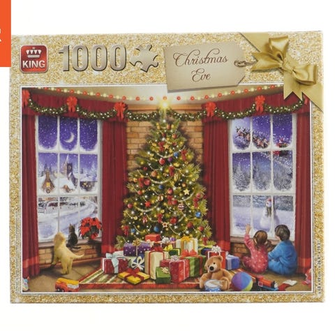 Dette er et puslespil med 1000 brikker med et julemotiv kaldet 'Christmas Eve'. Æsken viser en scene med juletræ, gaver og børn, der kigger ud af vinduet mod en sneklædt udsigt. Puslespillet er fra mærket King.