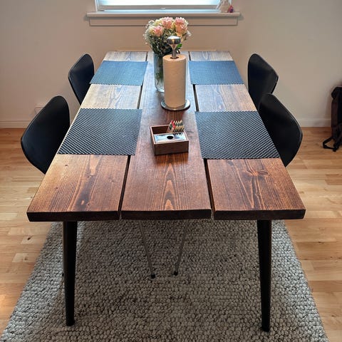 Måler 90 x 86. 43 cm fra gulv til overside af bordplade.