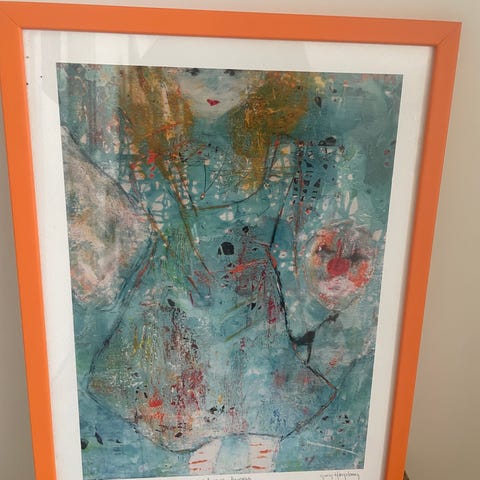 Rigtig pæn maleri/lærredstryk i sort svæveramme. Motiv: Rigdom kan være lykken kærlighed er det. Sign.; Marianne Hougaard 2011 b: 34 h: 34