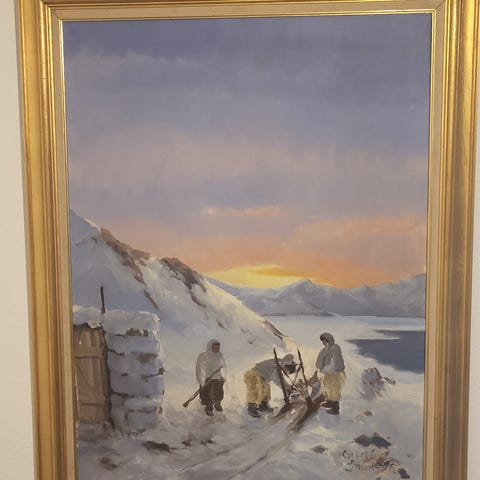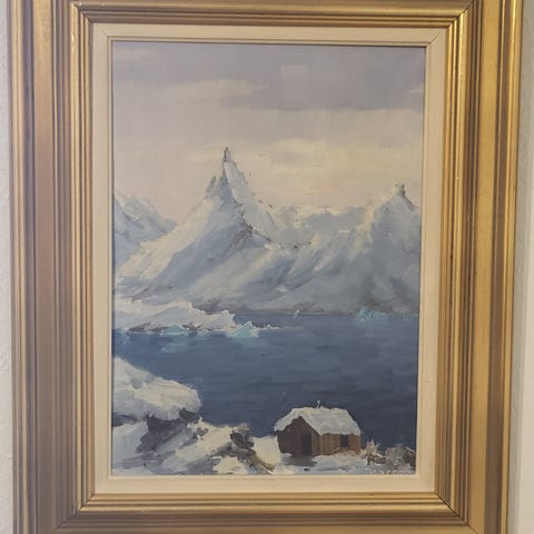 Billede af vinterlandskab monteret i glas og ramme. Motivet viser et snedækket landskab med huse og vandløb set fra afstand. Rammen er tynd og lys, sandsynligvis i metal eller malet træ. Velegnet til ophængning i stue, gang eller kontor. Størrelsen fremgår ikke præcist af billedet og bør eventuelt måles ved interesse.