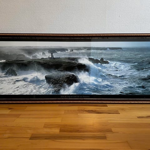 Billede med motiv af et passagerskib i arktisk landskab med is og bjerge i baggrunden. Billedet er indrammet i en enkel sort ramme med glasfront. Velegnet som vægdekoration i stue, kontor eller gang. Kan hænges op på væg eller stilles op ad en flade efter behov.