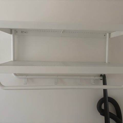 Dette er en vintage IKEA FRÄN væghylde, også kendt som en hattehylde eller skohylde, designet i 1980'erne eller 1990'erne i en postmoderne Memphis-stil med rød vinylbelagt metaltråd