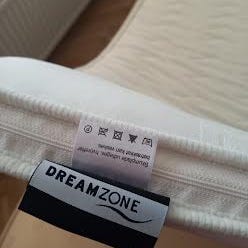 Sengeramme, Dreamzone-madras, rullemadras og topmadras i hvid. Madrassen har quiltet overflade og fremstår som en klassisk skummadras med glat liggeflade.