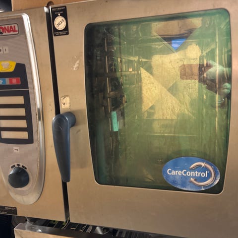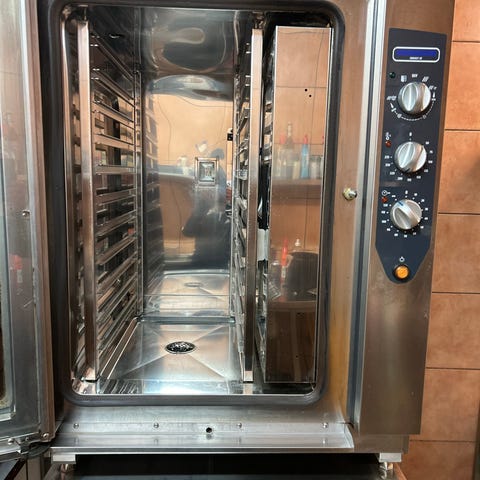 Rational kombiovn i rustfrit stål. Ovnen har frontbetjening med elektronisk panel i venstre side og manuel regulering nederst. Indvendigt er der flere riste og skinner til bageplader, egnet til professionel brug i storkøkken, bageri eller restaurant. Kabinettet er i rustfrit stål med glaslåge, så indholdet kan overvåges under tilberedning. Velegnet til tilberedning, bagning og opvarmning af større mængder mad i erhvervskøkkener.