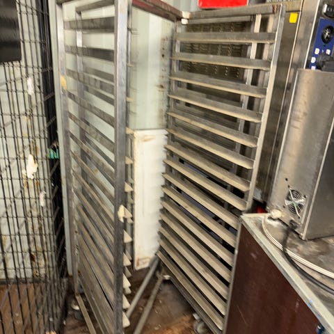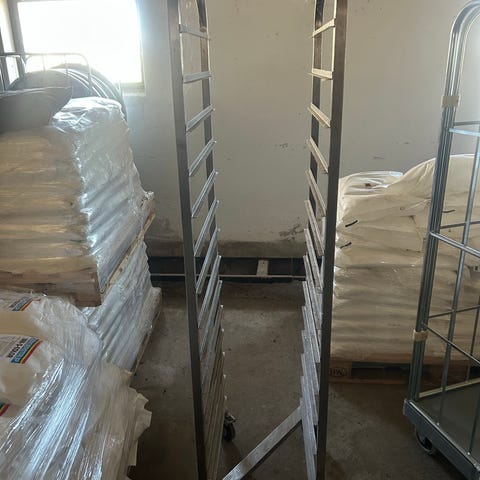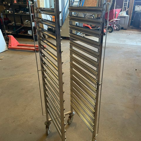 Bageri stilvogn til opbevaring og håndtering af bageplader. Vognen er udført i metal og har flere hylder til standard bageplader. Egnet til brug i bageri, konditori eller storkøkken, hvor der er behov for transport og opbevaring af brød, kager eller andre bagværk på plader. Vognen er åben i siderne for nem adgang til pladerne og kan typisk flyttes rundt efter behov i produktionslokalet.