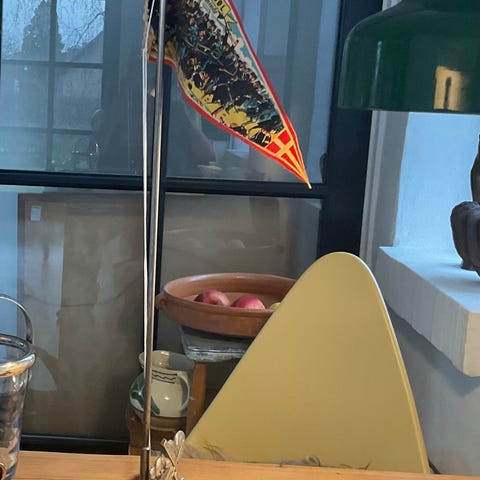 Bordflag med motivet "Slaget ved Dybbøl" monteret på metalstang. Foden er udført i mørk sten med påsat dekoration i metal med vindmøllemotiv. Flaget er trykt med farvet illustration af slagscenen og tekst. Fremstår med aldersrelaterede brugsspor.