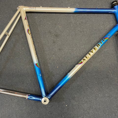 De Rosa racercykel stel med forgaffel – brugt. Klassisk italiensk kvalitetsstel i stål med karakteristiske De Rosa detaljer og hjertelogo ved samlinger. Fremstår i brugt stand med almindelige brugsspor. Inkl. forgaffel og monteret Campagnolo headset. Flot blå lakering med originale dekaler. Made in Italy.