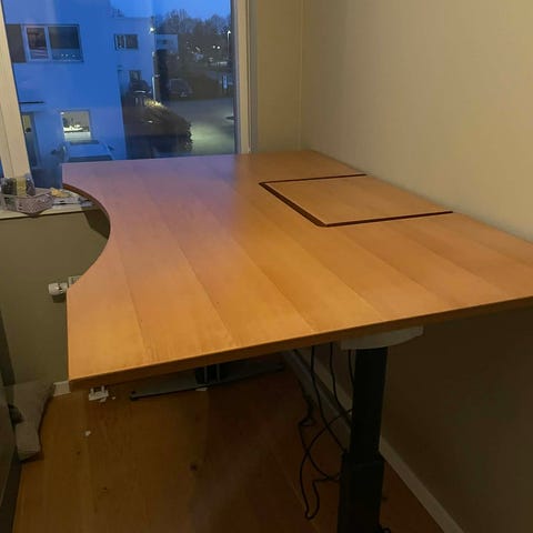 Hæve-/sænke skrivebord. Venstrevendt. Mål: 200 x 120/80 cm. Brugt.