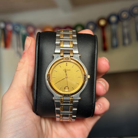Gucci gold plated Quartz ur med grøn/lyserød læder rem