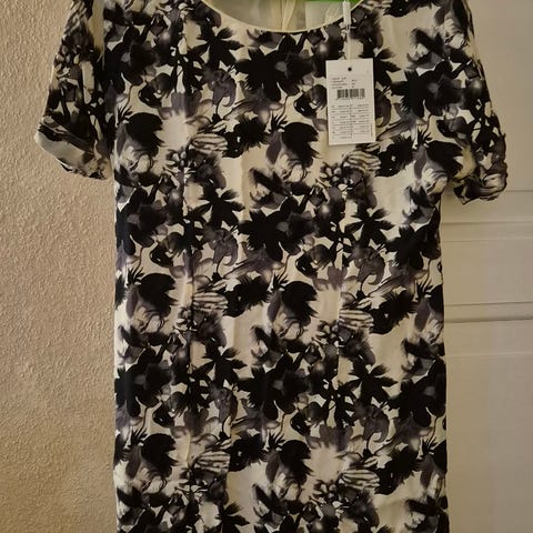Superflot grøn kjole fra InWear med flot detalje foran. Farven kalder InWear for 'warm green', jeg ville nok kalde den flaskegrøn. Kjolen er helt enkel med lange ærmer og med V-hals. Eneste "pynt" er den flotte knudedetalje foran. Den sidder til foroven ned til taljen hvor den er skåret og får større vidde i underdelen - nærmest A-facon i underdel. Kjolen er en str xxl, men den er lille i størrelsen synes jeg, men se selv mål. Måler ca 2 x 54 cm over brystet. Længden er ca 115 cm. Materiale: 94% recycled polyester/6% elastan. Den er helt ny og ubrugt og stadig med papmærke med pris. Den kostede 700 kr - jeg sælger den for 150 kr.