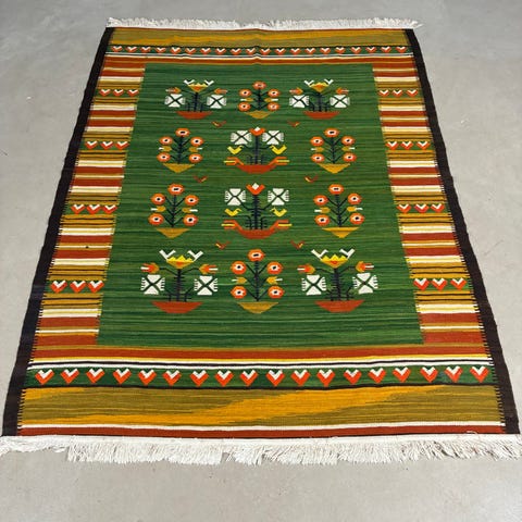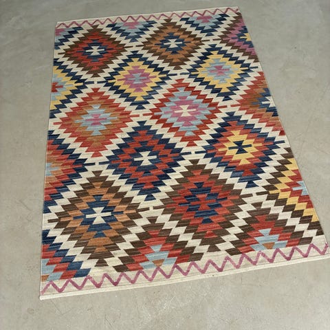 Smuk og autentisk kelim løber fra Afghanistan, håndvævet i uld med et traditionelt geometrisk diamantmønster. Tæppet har en elegant og levende farvepalette med varme røde, blå og grønne nuancer kombineret med en lys bund, som giver et let og stilfuldt udtryk.