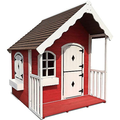 Træ legehus i sortmalet træ med hvid dør, småsprossede vinduer og lille veranda.