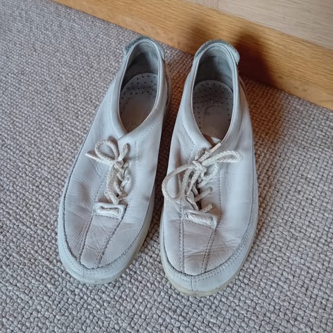 hvide snøresko i størrelse 45. Modellen er lave sko med snørelukning og perforeret indersål. Ydersålen er mønstret for bedre fodfæste. Velegnet som hverdagssko eller arbejdssko, hvor der ønskes lyse, lukkede sko.